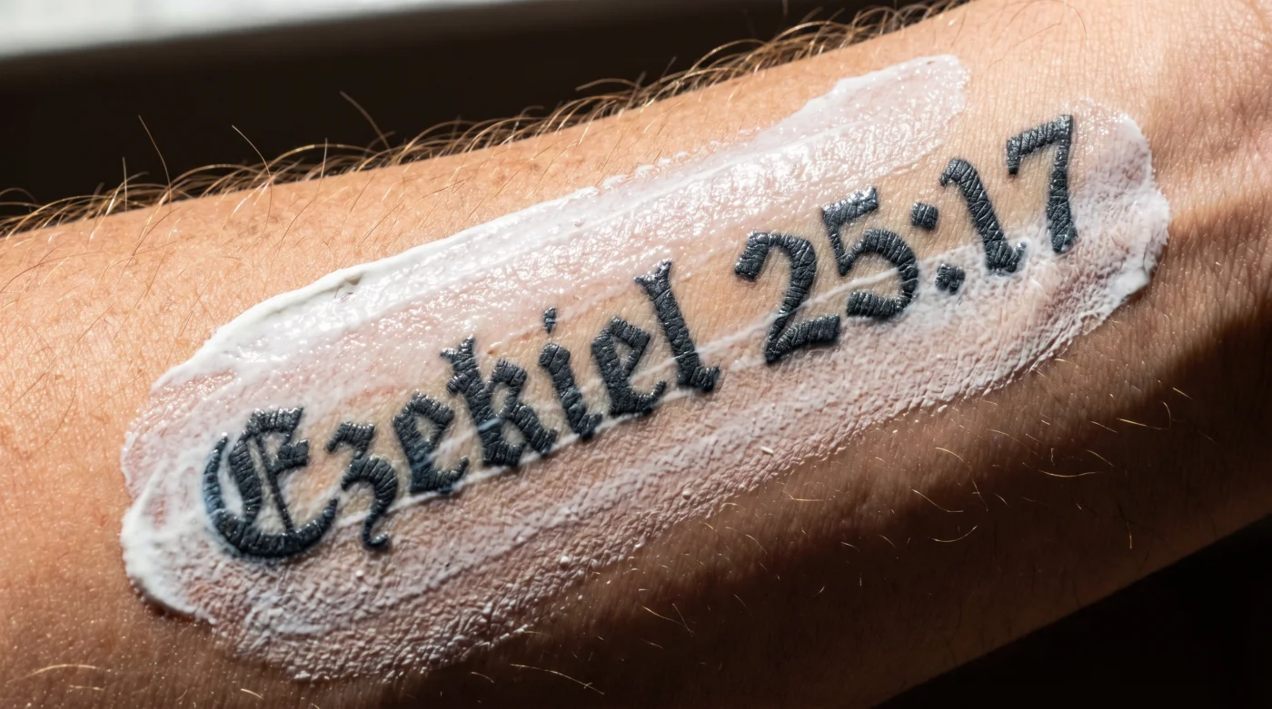 The chalky, slightly gritty slip of pure zinc oxide warms between your fingers. It smells faintly of crushed minerals and unscented lotion. You press it directly over the sharp, tight lettering of your fresh Ezekiel 25:17 script. The skin is still slightly warm, retaining a phantom hum from the tattoo machine. People request fine-line text expecting it to look like crisp typewriter ink forever, completely underestimating the biological warfare happening under the epidermis.