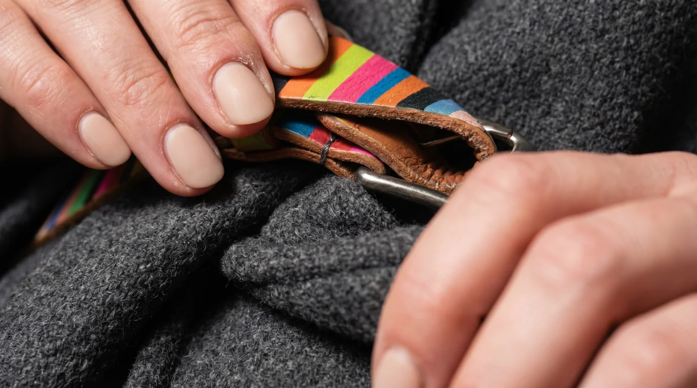 If you are in a rush, skip the clear elastic and use a strip of double-sided fashion tape directly on the inside of the belt’s tail, pressing it firmly into the main strap. For the purist dealing with extremely heavy coats rather than sweaters, leave the coat unbuttoned from the waist down. The belt acts as the sole closure point, allowing the heavy wool panels to fall naturally away from your hips, creating a dramatic A-line shape without the restricting bulk of fastened buttons.