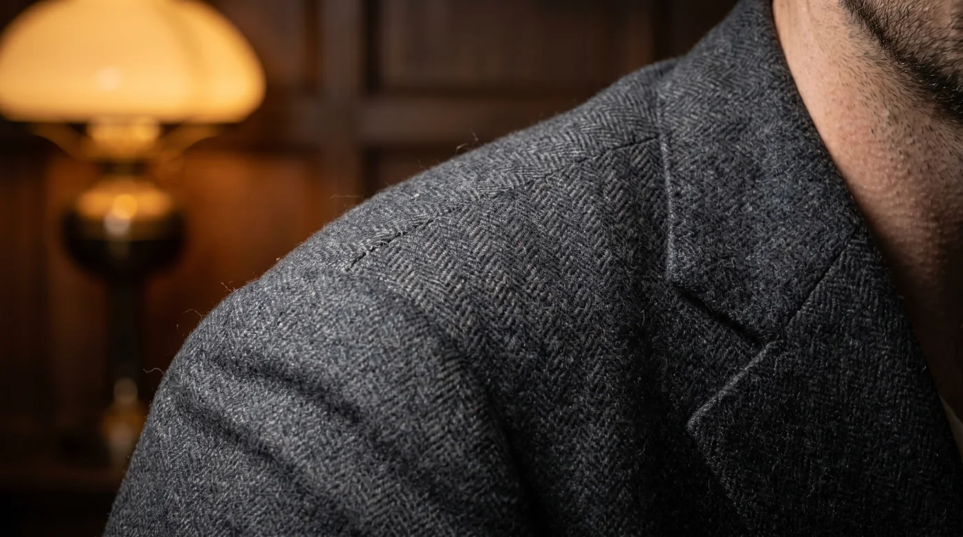 - Target the Shirt-Sleeve Shoulder: The pad must be completely removed. Mahon’s shared secret is to let the sleeve head attach directly to the body of the coat, creating a natural waterfall effect down the bicep. You should see the fabric immediately indent below the shoulder bone.